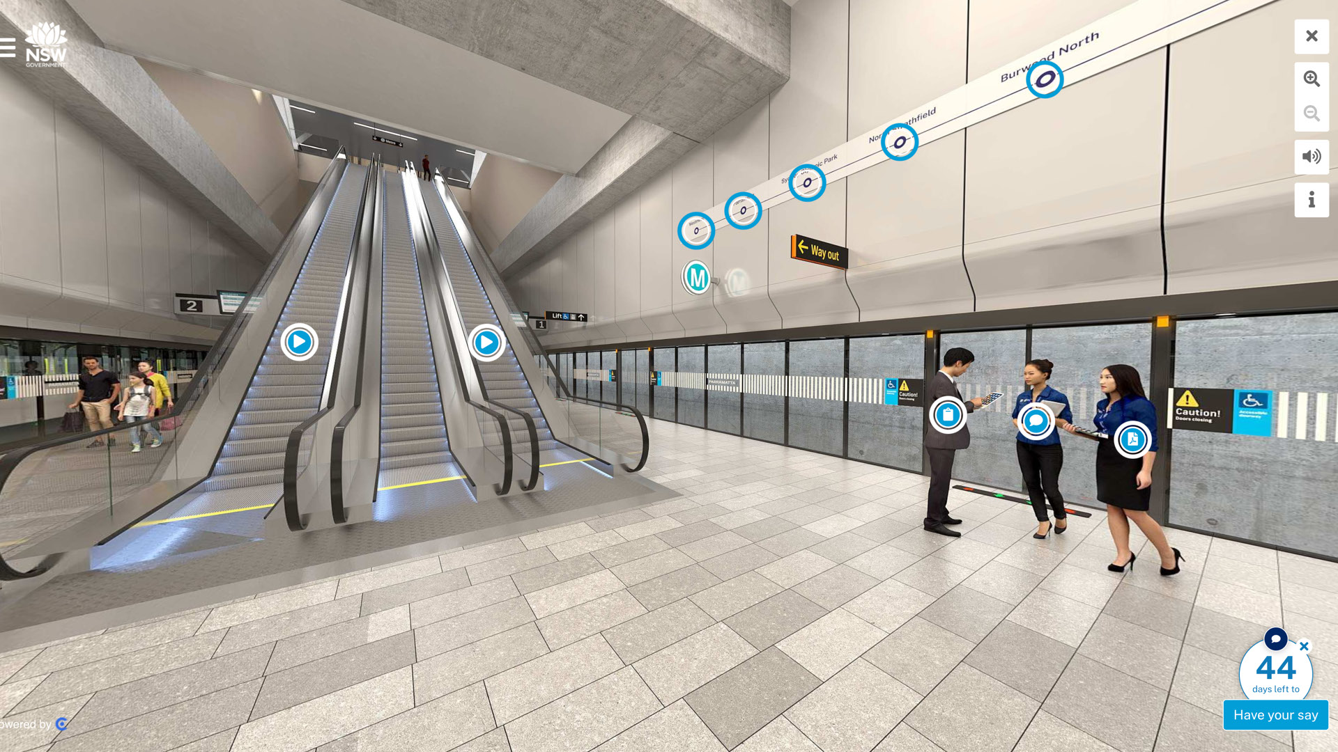 In response Spatial Media created an absolutely unique virtual engagement space inside the future Metro Station! Within the consultation period the community has the opportunity to review digital copies of the EIS, view 3D visualisations of the design, learn where the new stations will be, explore the project map and have their say by completing an offical submission via the room to the The Department of Planning, Industry and Environment.