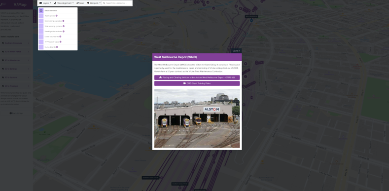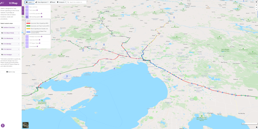 V/Map brings the entire V/Line network together in a structured tour format, presenting track layouts, speeds, controlling signallers, safe working systems, headlight and lease boundaries, TFP region types, and curve boards in a single searchable platform. Every station and piece of infrastructure is annotated with relevant procedures, reference documents, images, videos, and supporting training collateral, allowing drivers and trainees to explore and learn the network in an interactive and self-directed way.
