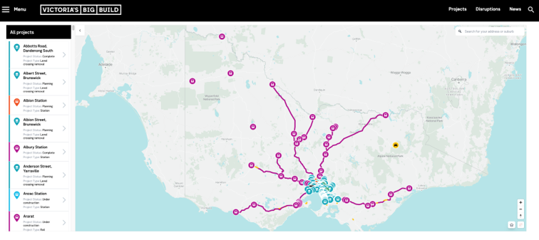 Spatial Media undertook a collaborative design and development process to create an interactive map for all projects for Victoria’s Big Build website on our SpatialEngage platform. The map allows for users to be able to see the entire portfolio of Victorian Government infrastructure projects across Victoria. You can search address and customise the map layers based on categories such as project type or status