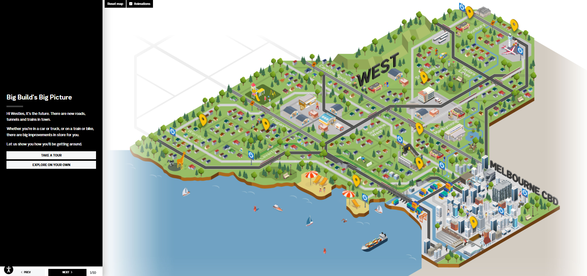 Our approach was to start with a creative workshop to explore concepts and ideas that created an interactive 3d style experience. Once we settled on the concept and style we then developed a custom animated 3D map of Melbournes West. It was important to capture key aspects of this part of Melbourne such as the airport, weribee Zoo, Williamstown, Sunshine and more.