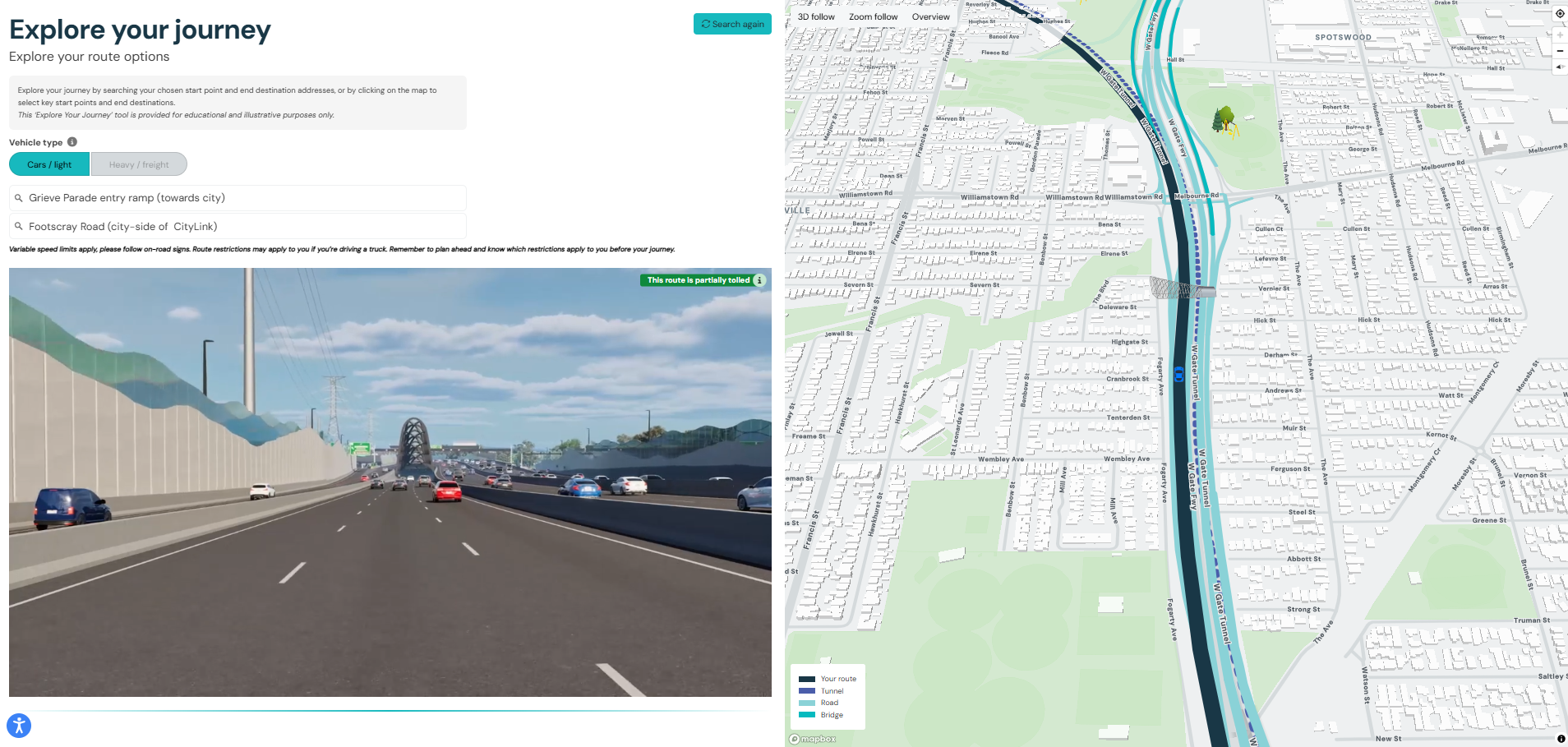 Spatial Media created an advanced Driver Journey tool gives community members and stakeholders a chance to plan and see new journeys on the widened West Gate Freeway, the West Gate Tunnel and new ramps and connections designed for quicker and easier travel.